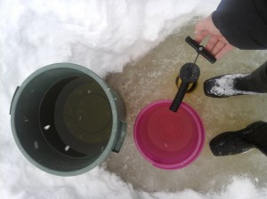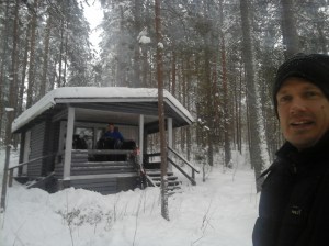 Seuraavana päivänä käytin ensi kertaa kairaani ja pumppuani saunavesien pumppaamiseksi avannosta. Toimi todella hyvin 🙂 Saunoimme ja Marko vastasi tapansa mukaan kaikkein kovimmista löylyistä minun tyytyessä jäähdyttelemään välillä verannan puolella. Hiihtelimme valoisassa takaisin tiistaina, Runebergin päivänä. Tasan kaksi vuotta sitten teimme samantyyppisen talviretken Kallaveden kalamajoille.