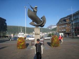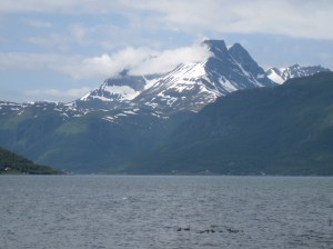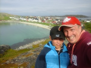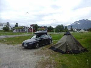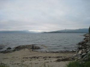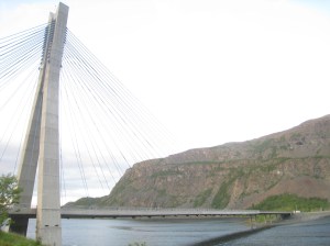 Jatkoimme matkaa seuraavaksi Hammerfestiin, jossa oli kaunis telttapaikka kaupungin ylärinteellä. Sieltä avautui mahtava näköala kauoungin ylle. Yöllä tosin tuuli niin että heräsin moneen kertaan ja yksi teltan tukikeppikin murtui. Seuraavana aamupäivänä bongasimme satamaan rantautuneen maitovalaan. Tämä oli hieno kokemus, kun koko kylä kerääntyi aamulla ihastelemaan sen ruokailua ja pientä temppuiluakin ammattilaisten ohjaamana. Liekö ollut venäläinen sirkuskala vai salainen agentti, ota siitä selvää 🙂 Hammerfest sijaitsee Kvaloyan saarella ja Kvalsundissa komea silta ylittää meren. Tässä vieressä oli myös pieni kauppa, jossa kävimme paluumatkalla. Kävin luonnollisesti uimassa myös vuonossa ja Goahtemuorjohkan joessa, joka tästä kohtaa yhtyi sisämaahan.
