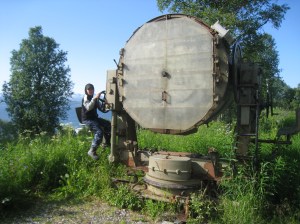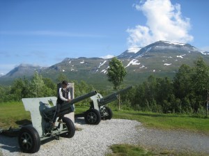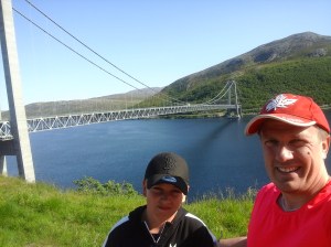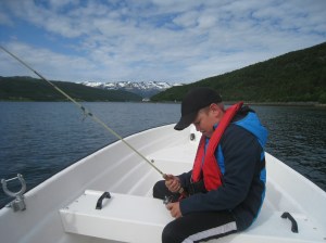 Seuraavaksi jatkoimme Altaan, jossa muinaisia kalliopiirroksia ym. esittelevä Alta-museo on käymisen arvoinen paikka. Kåfjordissa bongasimme myös Tirpitz-museon ulkoa päin. Silti saimme pihallakin tästä irti yllättävän paljon ja kävin kuvaamassa vuonon rannalta, jossa pari kalastajaa kalastivat kovassa virtauksessa. Kävin uimassa Alattionvuonossa ja Alattionjoessa. Jatkoimme E6-rantatietä eteenpäin ja seuraava virstanpylväs oli Bufjordin pikkukylä pienen lahden pohjukassa. Tämä lahti muodostaa ns. sivuvuonon Kvaenangenin vuonolle. Tien vieressä oli karavanaareiden pysähtymis / yöpymispaikka ja vesipiste ja pienvenesatama. Huoltoasema ja kauppa oli tosin myös. Päätimme pystyttää illan tullen teltan veneenlaskupaikan viereen. Rannalla oli jokin rakennus, jonka edessä oli sopivasti pieni pöytä ja kaksi tuolia. Siinä söimme aamiaista seuraavana aamuna 10.7. Lopettelimme syömistä kun mökkiläinen tuli siivoamaan rakennusta ja kysyin pihalla olevasta kanootista olisiko sitä voinut lainata. Tämä oli hänen ystävänsä, joten ei valitettavasti onnistunut mutta norjalainen mies huikkasi heti perääni että jos viitsisin auttaa häntä veneen vesille laskemisessa niin hän lainaisi meille kalastusvehkeet ja veneen niin voisimme kokeilla kalastusta. Ei tarvinnut kauan miettiä suunnitelmien muuttamista tällaisen tarjouksen tullessa. Päätimme viettää tämän päivän kalastuksen parissa. Kiskoimme veneen ulos varastorakennuksesta ja nostimme Arnt-Eirikin veneen trailerin päälle. Kiinnitimme trailerin autoni perään ja ajoin vastapäiselle huoltikselle. Trailerin renkaat pumpattiin täyteen ilmaa ja tulimme takaisin rantaan. Veneen lasku rampilta onnistui yllävänkin helposti ja teimme koeajon jolla varmistimme Mercuryn toimivuuden. Arnt-Eirik jäi rantaan kun lähdin Juliuksen kanssa kiertämään lahtea. Meillä oli virveli ja pohjaan laskettava siima, jolla oli tarkoitus saada ne (tosi) isot vonkaleet. Ehdimme vetää vain hetken siimoja, kun Juliuksen laskeman virvelin siimaan tuntui nykäisy. En ollut uskoa todeksi että näin nopeasti olisi tärppi. Tunnustelin ja tunsin että kala oli kiinni. Meillä ei tietysti ollut virveliä mukana, toivoin että kala olisi kunnolla kiinni. En ollut koskaan ennen itsekään kalastanut ulkomailla, joten tämä oli jännä ja hauska kokemus. Tunsin kalan nykivän päässä ja lopulta kauniin ruskea turska tuli pintaan. Sain tämän onneksi hyvin käsillä ylös veneeseen. Juhlahetki! 😀 Tämä oli ehdottomasti retken mieleenpainuvimpia kohokohtia. Kiersimme vielä koko lahden ympäri huolellisesti siltä varalta tulisiko lisää tärppejä mutta ei tullut. Tämä turska oli kuitenkin enemmän kuin tarpeeksi. Arnt-Eirik puntaroi turskan aika tarkkaan kilon painoiseksi ja perkasi kalan nopeasti rannalla. Kala viipaloitiin muutamaksi palaksi fileerausveitsellä, ripaus suolaa ja kiehumaan kattilaan. Perunoita ja norjalaista voita palan painikkeeksi. Oli suussa sulavan hyvän makuista;) Illalla lähdimme jatkamaan matkaa, suurkiitokset vielä Arnt-Eirikille, ystävälliselle norjalaiselle tästä mahdollisuudesta 🙂