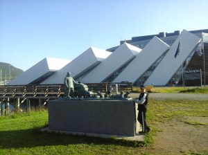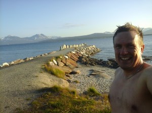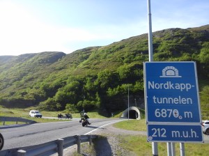 Uskaltauduimme kuitenkin lopulta Norjan puolelle ja kävin uimassa Kaarasjoessa Kaarasjoen kylässä. Sää oli melko viileää edelleen täällä päin pohjoista ja vesi riittävän virkistävää, ettei tehnyt mieli jäädä sinne oleilemaan 😉 Jatkoimme ajoa Porsangerinvuonoa kohti ja löysimme yöpymispaikan vuonon pohjukasta Lemmijoelta. Kävin uimassa luonnollisesti samannimisessä joessa ja vuonossa seuraavana aamuna kun aurinko jo näyttäytyi. Lähdimme ajamaan kohti pohjoista. Suomalainen matkaaja kalasti yhdessä kohtaa pitkällä ongella silakkaa ja kilohailia. Kävin uimassa uudestaan yhdellä levähdyspaikalla. Mageroyan saarelle johti yli kuusi kilometriä pitkä Nordkapp-tunneli, joka laskeutui ensin pitkään meren pohjaan ennen kuin alkoi nousta ylöspäin. Vettä tihkui pimeässä tunnelissa katosta. Saavuimme lopulta Honningsvägiin, jossa satoi ja tuuli. Onneksemme tapasimme suomalaisen turistioppaan Joel Jaakkolan paikallisessa kebabravintolassa, joka oli niin ystävällinen että tarjosi meille yösijaa asunnossaan. Tämä auttoi todella paljon, suurkiitos vielä tästä! 🙂 Olimme kaksi yötä Honningsvägissä jona aikana kapusimme Nordkappiin. Siellä oli jäätävä sumu ja tuuli mutta kiersimme turistikeskuksen ja otimme peruskuvat aurinkokellon luota. Norjan kuningas Oskar II kunniaksi oli myös patsas pihalla. Tulipahan käytyä Euroopan mantereen pohjoisimmassa pisteessä 🙂 Paitsi että oikeasti tämä olikin ns. norjalainen turistihuijaus. Turistirysä sijaitsi saarella eikä edes ko. Mageroyan saaren pohjoisimmassa kohtaa 😉 Kävimme myös Nordkapp-museossa Honningsvägissä. Kirkeporten oli todella komea luonnonnähtävyys alueella. Kävin uimassa myös yhdessä lammikossa vuoristotien varrella lähellä Nordkappia.