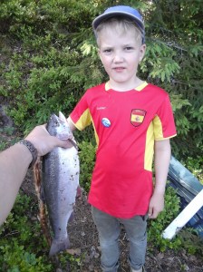 Olin Nicolaksen kanssa kalastamassa Perniön Matildanjärvellä lastentapahtumassa kirjolohia onkivavalla, jossa käytettiin syöttinä taikinaa. Saimme kaksi komeaa lohta, mikä olikin maksimikiintiö. Vanha kalakaverini Timo Saarinen oli tapahtumassa mukana kalakummin roolissa ja tiesi parhaat ottipaikat taas nappiin onnistuneesti. Mukana oli myös toinen lapsiperhe, joka sai kiintiönsä yhtä lailla täyteen.