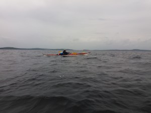 Vastatuuli oli haastava tähän asti Päijänteellä, mutta onneksi tuulen suunta kääntyi lauantaina myötäiseksi. Oli pieni leppoisa myötätuuli, joka vähitellen alkoi voimistua meloessamme Judinsalon selkää suoraan kohti etelää. Kaijansalon ja Jänissaaren välissä tuuli nousi ukkospuuskamaisesti yli kympin ja myräkkä nappasi kajakeistamme kunnolla kiinni. Huomasin kun Siskon ja Matin kajakki syöksyi spiraalimaisesti edessämme muuttaen suuntaa ennen kuin korjasi kurssia takaisin. Sain onneksi pidettyä oman kajakin suoraan myötätuuleen ja pääsimme Jänissaaren ja Jorosaaren välistä suojaan. Pidimme taukoa tuulessa juuri Tehin silmän kohdalla tarppikankaan alla. Sitten jatkoimme Tehinselän yli, kun tuuli oli riittävästi tyyntynyt. Meloimme Kelventeen saaren Isohietaan yöpymään. Kelvenne on todella kaunis pitkänomainen saari jossa on useita hienoja hiekkarantoja.