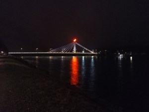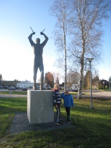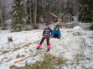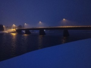 Lauantain 17.10. alkoikin sataa lunta.Onneksi Lahdessa Marko oli vaihtanut talvirenkaat alle ja pääsimme hiekkatien pätkän noin 5 km maantielle asti ilman ongelmia. Markus Pyhälä tuli myös mökille sunnuntaina kun olimme lähdössä. Kävimme tutustumassa lumisateiseen Kittilään, kirkko ja kotiseutumuseo tuli nähtyä ulkoa päin ja komea Ounasjoen ylittävä silta uimarannan kupeessa. Ajoimme Rovaniemen kautta ihastelemassa keskustan nähtävyydet, kirkon ja patsaat sekä Jätkänkynttilän sillan pimeän valaistuksessa. Ajoimme yöksi taas Kemin Lapintuulen huoltoasemalle.