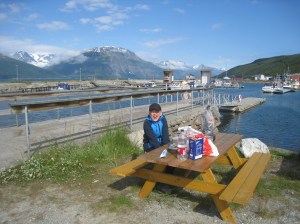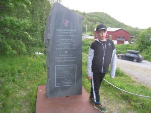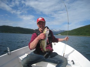 Seuraavaksi jatkoimme Altaan, jossa muinaisia kalliopiirroksia ym. esittelevä Alta-museo on käymisen arvoinen paikka. Kåfjordissa bongasimme myös Tirpitz-museon ulkoa päin. Silti saimme pihallakin tästä irti yllättävän paljon ja kävin kuvaamassa vuonon rannalta, jossa pari kalastajaa kalastivat kovassa virtauksessa. Kävin uimassa Alattionvuonossa ja Alattionjoessa. Jatkoimme E6-rantatietä eteenpäin ja seuraava virstanpylväs oli Bufjordin pikkukylä pienen lahden pohjukassa. Tämä lahti muodostaa ns. sivuvuonon Kvaenangenin vuonolle. Tien vieressä oli karavanaareiden pysähtymis / yöpymispaikka ja vesipiste ja pienvenesatama. Huoltoasema ja kauppa oli tosin myös. Päätimme pystyttää illan tullen teltan veneenlaskupaikan viereen. Rannalla oli jokin rakennus, jonka edessä oli sopivasti pieni pöytä ja kaksi tuolia. Siinä söimme aamiaista seuraavana aamuna 10.7. Lopettelimme syömistä kun mökkiläinen tuli siivoamaan rakennusta ja kysyin pihalla olevasta kanootista olisiko sitä voinut lainata. Tämä oli hänen ystävänsä, joten ei valitettavasti onnistunut mutta norjalainen mies huikkasi heti perääni että jos viitsisin auttaa häntä veneen vesille laskemisessa niin hän lainaisi meille kalastusvehkeet ja veneen niin voisimme kokeilla kalastusta. Ei tarvinnut kauan miettiä suunnitelmien muuttamista tällaisen tarjouksen tullessa. Päätimme viettää tämän päivän kalastuksen parissa. Kiskoimme veneen ulos varastorakennuksesta ja nostimme Arnt-Eirikin veneen trailerin päälle. Kiinnitimme trailerin autoni perään ja ajoin vastapäiselle huoltikselle. Trailerin renkaat pumpattiin täyteen ilmaa ja tulimme takaisin rantaan. Veneen lasku rampilta onnistui yllävänkin helposti ja teimme koeajon jolla varmistimme Mercuryn toimivuuden. Arnt-Eirik jäi rantaan kun lähdin Juliuksen kanssa kiertämään lahtea. Meillä oli virveli ja pohjaan laskettava siima, jolla oli tarkoitus saada ne (tosi) isot vonkaleet. Ehdimme vetää vain hetken siimoja, kun Juliuksen laskeman virvelin siimaan tuntui nykäisy. En ollut uskoa todeksi että näin nopeasti olisi tärppi. Tunnustelin ja tunsin että kala oli kiinni. Meillä ei tietysti ollut virveliä mukana, toivoin että kala olisi kunnolla kiinni. En ollut koskaan ennen itsekään kalastanut ulkomailla, joten tämä oli jännä ja hauska kokemus. Tunsin kalan nykivän päässä ja lopulta kauniin ruskea turska tuli pintaan. Sain tämän onneksi hyvin käsillä ylös veneeseen. Juhlahetki! 😀 Tämä oli ehdottomasti retken mieleenpainuvimpia kohokohtia. Kiersimme vielä koko lahden ympäri huolellisesti siltä varalta tulisiko lisää tärppejä mutta ei tullut. Tämä turska oli kuitenkin enemmän kuin tarpeeksi. Arnt-Eirik puntaroi turskan aika tarkkaan kilon painoiseksi ja perkasi kalan nopeasti rannalla. Kala viipaloitiin muutamaksi palaksi fileerausveitsellä, ripaus suolaa ja kiehumaan kattilaan. Perunoita ja norjalaista voita palan painikkeeksi. Oli suussa sulavan hyvän makuista;) Illalla lähdimme jatkamaan matkaa, suurkiitokset vielä Arnt-Eirikille, ystävälliselle norjalaiselle tästä mahdollisuudesta 🙂