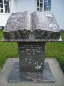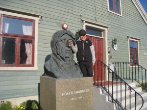 Julius Roald Amundsenin museon edustalla löytöretkeilijän patsaan edessä.