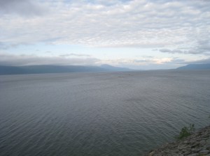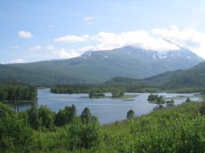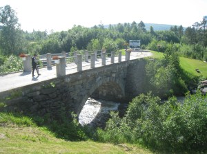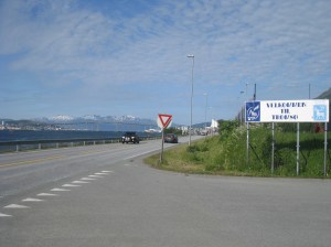 Jatkoimme matkaa seuraavaksi Hammerfestiin, jossa oli kaunis telttapaikka kaupungin ylärinteellä. Sieltä avautui mahtava näköala kauoungin ylle. Yöllä tosin tuuli niin että heräsin moneen kertaan ja yksi teltan tukikeppikin murtui. Seuraavana aamupäivänä bongasimme satamaan rantautuneen maitovalaan. Tämä oli hieno kokemus, kun koko kylä kerääntyi aamulla ihastelemaan sen ruokailua ja pientä temppuiluakin ammattilaisten ohjaamana. Liekö ollut venäläinen sirkuskala vai salainen agentti, ota siitä selvää 🙂 Hammerfest sijaitsee Kvaloyan saarella ja Kvalsundissa komea silta ylittää meren. Tässä vieressä oli myös pieni kauppa, jossa kävimme paluumatkalla. Kävin luonnollisesti uimassa myös vuonossa ja Goahtemuorjohkan joessa, joka tästä kohtaa yhtyi sisämaahan.