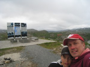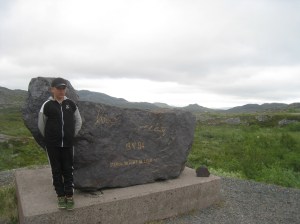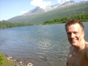 Uskaltauduimme kuitenkin lopulta Norjan puolelle ja kävin uimassa Kaarasjoessa Kaarasjoen kylässä. Sää oli melko viileää edelleen täällä päin pohjoista ja vesi riittävän virkistävää, ettei tehnyt mieli jäädä sinne oleilemaan 😉 Jatkoimme ajoa Porsangerinvuonoa kohti ja löysimme yöpymispaikan vuonon pohjukasta Lemmijoelta. Kävin uimassa luonnollisesti samannimisessä joessa ja vuonossa seuraavana aamuna kun aurinko jo näyttäytyi. Lähdimme ajamaan kohti pohjoista. Suomalainen matkaaja kalasti yhdessä kohtaa pitkällä ongella silakkaa ja kilohailia. Kävin uimassa uudestaan yhdellä levähdyspaikalla. Mageroyan saarelle johti yli kuusi kilometriä pitkä Nordkapp-tunneli, joka laskeutui ensin pitkään meren pohjaan ennen kuin alkoi nousta ylöspäin. Vettä tihkui pimeässä tunnelissa katosta. Saavuimme lopulta Honningsvägiin, jossa satoi ja tuuli. Onneksemme tapasimme suomalaisen turistioppaan Joel Jaakkolan paikallisessa kebabravintolassa, joka oli niin ystävällinen että tarjosi meille yösijaa asunnossaan. Tämä auttoi todella paljon, suurkiitos vielä tästä! 🙂 Olimme kaksi yötä Honningsvägissä jona aikana kapusimme Nordkappiin. Siellä oli jäätävä sumu ja tuuli mutta kiersimme turistikeskuksen ja otimme peruskuvat aurinkokellon luota. Norjan kuningas Oskar II kunniaksi oli myös patsas pihalla. Tulipahan käytyä Euroopan mantereen pohjoisimmassa pisteessä 🙂 Paitsi että oikeasti tämä olikin ns. norjalainen turistihuijaus. Turistirysä sijaitsi saarella eikä edes ko. Mageroyan saaren pohjoisimmassa kohtaa 😉 Kävimme myös Nordkapp-museossa Honningsvägissä. Kirkeporten oli todella komea luonnonnähtävyys alueella. Kävin uimassa myös yhdessä lammikossa vuoristotien varrella lähellä Nordkappia.