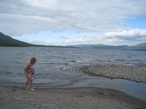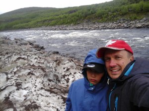 Me emme kuitenkaan jatkaneet kammille emmekä enempää etelään, vaan takaisin kohti pohjoista ja yövyimme Tenojoen varrella Nuorgamin keskustassa olevan grillikatoksen pihalla. Yövyimme kuitenkin teltassa koska Julius vierasti katoksessa yöpymistä. Sadetta tihutti taas. Seuraavana aamuna kävin uimassa Tenojoessa, ennen kuin jatkoimme matkaa kohti Utsjokea. Tenontie on kokonaisuutena mahtava maisemareitti, ehkä jopa koko Suomen kaunein. Kauniita pysähdyspaikkoja on useita ja joki menee koko ajan melko lähellä tietä. Utsjoella tutustuimme kirkkoon ja kauniiseen museoalueeseen Mantojärven rannalla. Kävin pulahtamassa Mantojärvessä ja jatkoimme takaisin Tenontielle.