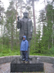 Julius kirjailija Ilmari Kiannon patsaalla Suomussalmella Kiantajärven rannalla.