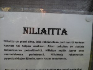 Niliaitan infoteksti. Näissä oli ennen vanhaan tapana säilyttää ruokaa suojassa petoeläimiltä.