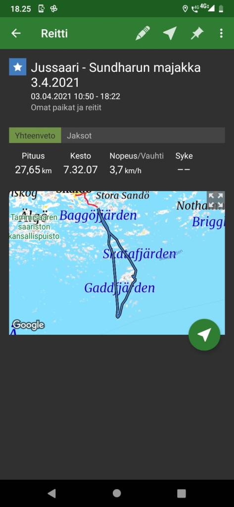 Meloimme Baggöstä Jussaaren länsipuolelta Sundharun majakalle jossa tuli opeteltua myös leijan lennätystä. Sopivat ilmavirtaukset saarella antoivat hyvää nostetta tällaiseenkin testaamiseen. Matkaa tuli 27 km. Edellisen kerran meloin Jari Pihlajamäen kanssa kovassa tuulessa majakan ympäri kesällä 2013, nyt oli mielenkiintoista päästä rantautumaankin paikalle paremmalla säällä. Meloimme takaisin Jussaaren itäpuolelta ja näimme yhden hyvän lahdenpoukamankin tässä kohtaa. Testasimme nyt majakan pihalla myös Petrin leijaa, ns. Stukaa joka olikin mielenkiintoinen kokemus opetella hallitsemaan tuulivirtauksia tunnistamalla ja hyödyntämällä. Muutamia kertoja leija leijaili itselläni majakan seinään ennen kuin alkoi saada tuntumaa leijailuun 🙂 Majakan tornista oli mahtavat näköalat merelle kirkkaana päivänä.