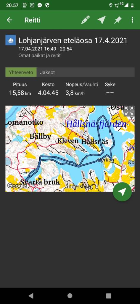 Meloimme Kaj Auran kanssa tämän kauniin reitin ensimmäistä kertaa. Lähdimme venerannasta Mustion ruukin pohjoispuolelta Hållsnäsintien varresta ja aluksi pienen saaren halkaiseman kapeikon jälkeen pääsimme isommalle selälle. Korpuddenin niemi oli kaunis luonnosuojelualue jonka kärjessä pidimme tauon paluumatkalla ja bongasimme myös kalasääksen pesän korkean männyn latvassa. Kiersimme Kajsasklippanin ja Vassgrundetin saaret sekä Mangsön suuren saaren ympäri. Matkaa tuli reilu 15 km. Sää oli kaunis ja aurinkoinen.