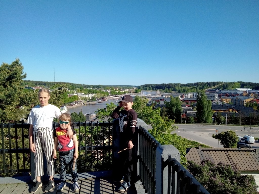 Diana, Magnus ja Nicolas Porvoon näköalatasanteella joen länsipuolella.