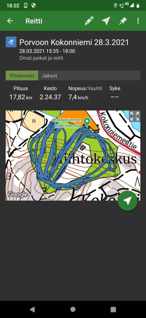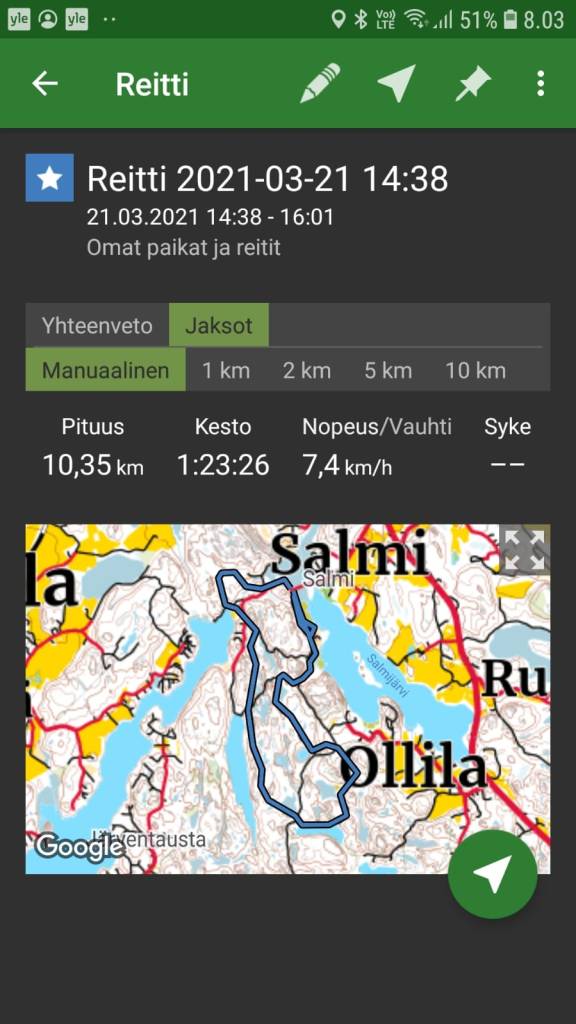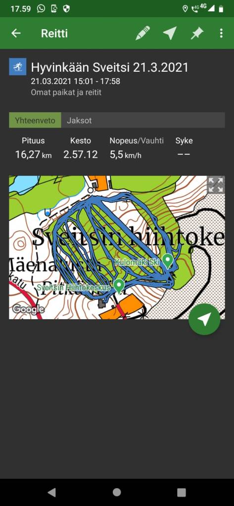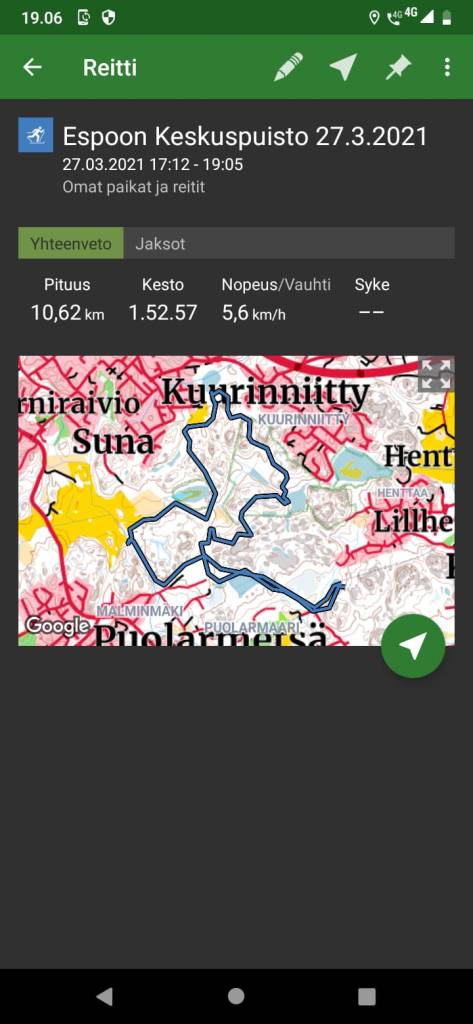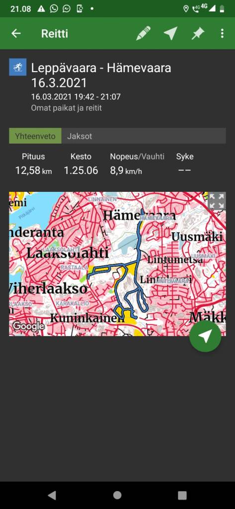 Hiihdin Leppävaaran ”vuoristoradan” 5,2 km 9km/h keskinopeudella.