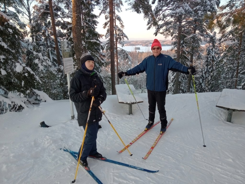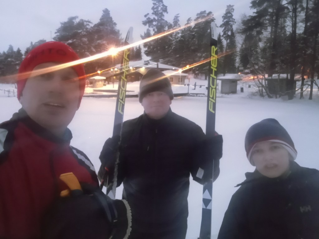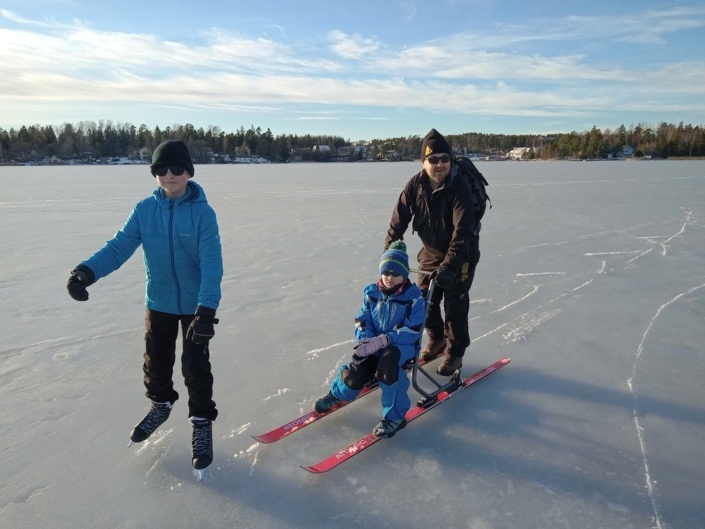 Kävimme kokeilemassa retkikelkkaani ja luistelua Espoon Suinonsalmen uimrannalta Suvisaariston sisälahdessa muutaman kilometrin. Marko Suni kokeili ensi kertaa retkikelkkaa Nicolas kyydissään ja Markus luisteli. Keli oli aika nihkeä, koska aurinko oli ehtinyt lämmittää pintajäätä sohjoiseksi muuten hieno päivä.