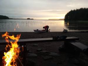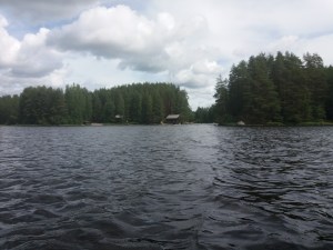 Maanantaina kävin uimassa ja söimme aamiaisen katoksen alla kanavan kupeessa. Meloimme kanavan läpi aluksi ja jatkoimme kohti Kiesimän kanavaa. Kävin uimassa Kiesimän järvessä kun pidimme pienen tauon ennen kanavan läpi melontaa. Paikalla on myös grillikatos ulkoilijoille. Pohjois-Konneveden läpi meloessamme piti ohittaa petolliset Murhaluodot, kun katsoin taivaalle ja luulin synkän pilven menevän ohi, kun se olikin suoraan yläpuolellamme. Alkoi niin kova sade että näkyvyys hävisi hetkeksi täysin ja puhuri skannasi editsemme. Onneksi aallokko oli matalaa mutta sade oli todella poikkeuksellisen kova. Neiturin kanavalla pidimme tauon ja söimme lounasta. Neiturin kanava on kaunis alue, siellä on myös vanhoja juoksuhautoja hieman kauempana. Tulimme Lavianselälle jossa oli aurinkoista mutta 7-8 metrin sivutuuli joka oli aika hankala pitkällä Starillani. Ohjasin varmuuden vuoksi lähemmäksi rantaa kun ohitimme Pängätsalon pohjoispuolelta. Yövyimme Viukarinsaarilla, jossa oli saunamökki ja kota. Yövyin Esan ja Minnan kanssa kodassa ja Esan hyttyskarkote toimi hyvin. Vesi oli yllättävän viileää kun kävimme saunasta uimassa.